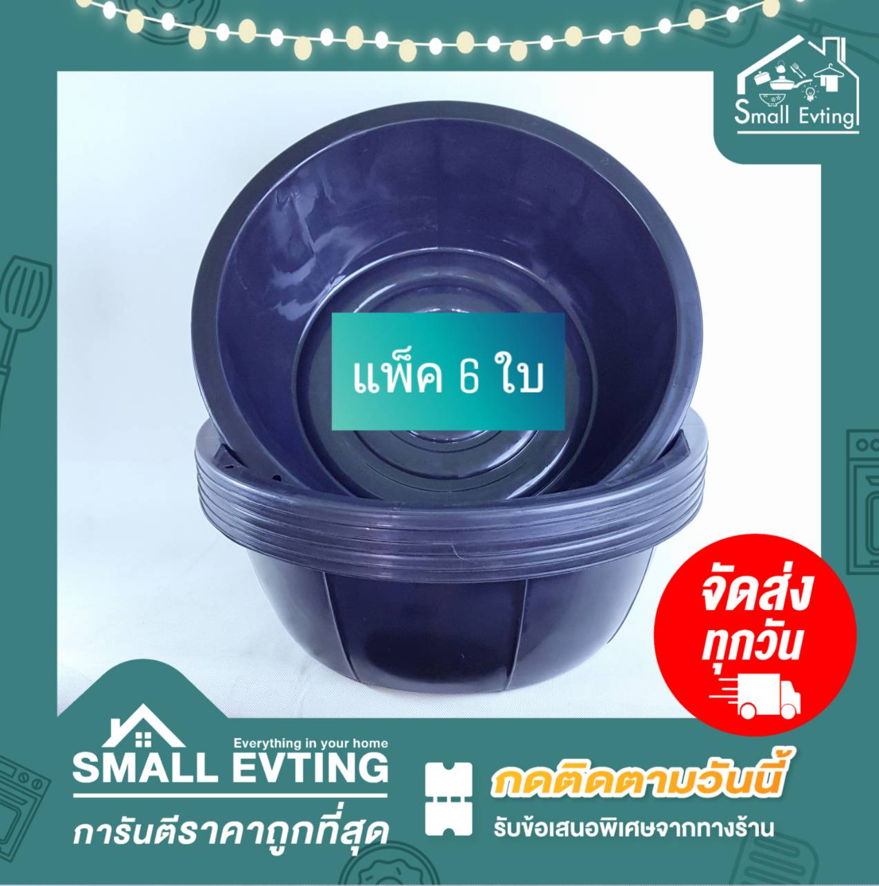 Small Evting กะละมัง พลาสติก สีดำ (แพ็ค 6 ใบ) ขนาด19 นิ้ว กะละมังเลี้ยงไส้เดือน อย่าลืม !! กดติดตามร้าน "รับส่วนลดเพิ่ม" กะละมังซักผ้า กะละมังอเนกประสงค์